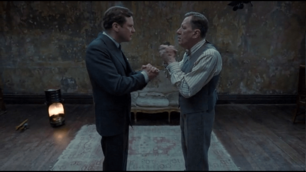 Y si nos centramos en la fotografía, es que el nivel sigue alto: tiene la originalidad justa para romper ciertos moldes pero a la vez no ser tan experimental. Me encanta cómo cambia la dinámica clásica de muchos planos (como en los diálogos, cómo deja al personaje que habla en el tercio contrario, cómo deja muchos espacios en sitios clave, para reflejar el vacío y a la vez el estrés de Jorge por no saber cómo lidiar con la situación). Por no hablar de ciertos travellings, que se te quedan grabados en la memoria: cuando sube las escaleras de Wembley, cuando sigue al rey en su camino hasta la última sala, saludando a todo el personal. Todo 10.